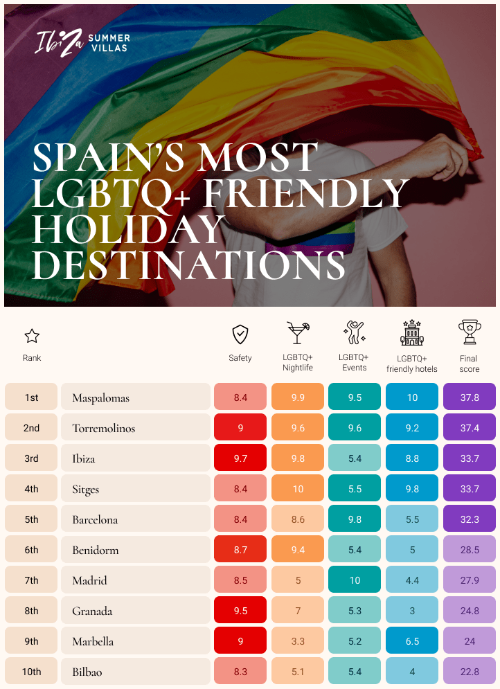 But with so much of Spain being inclusive and gay-friendly, where are the best places for LGBTQ+ people to go on holiday overall? The travel experts here at Ibiza Summer Villas have been analysing levels of reported hate crime, the number of gay-friendly hotels, gay bars and restaurants, and gay events hosted in different towns and cities around Spain to figure which destinations are the best pick.