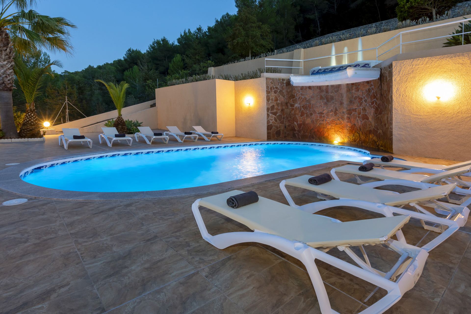 La zona de barbacoa esta junto a la piscina y cuenta también con una zona de bar. La gran mesa de comedor al aire libre pero a su vez cubierta es un gran lugar para pasar el rato con la familia o amigos. La piscina cuenta con una impresionante cascada y jacuzzi para relajarse y disfrutar de las vistas de la ciudad de Ibiza y el campo circundante. También hay una pista de tenis en la vivienda la cual invitamos a utilizar.
