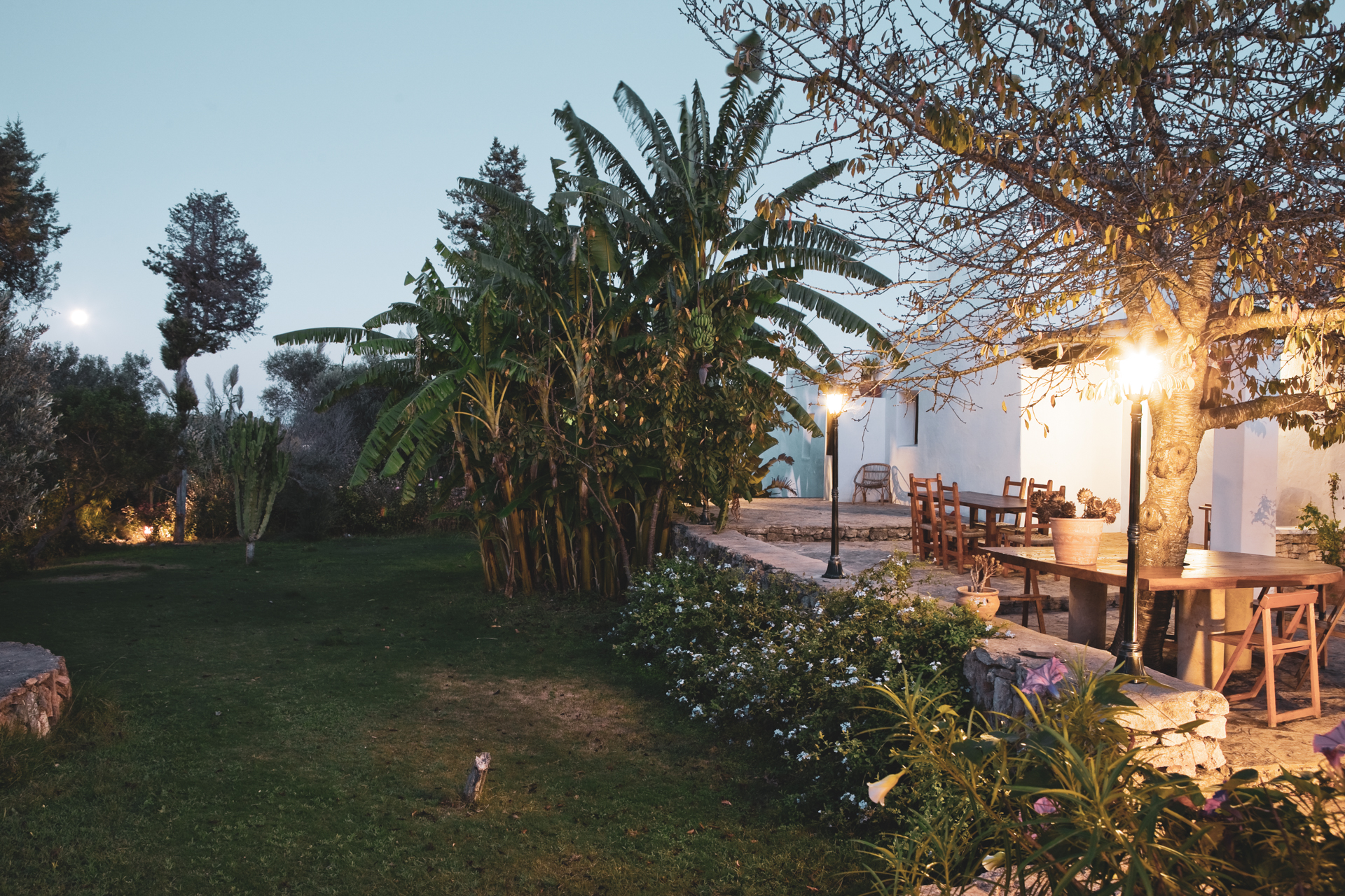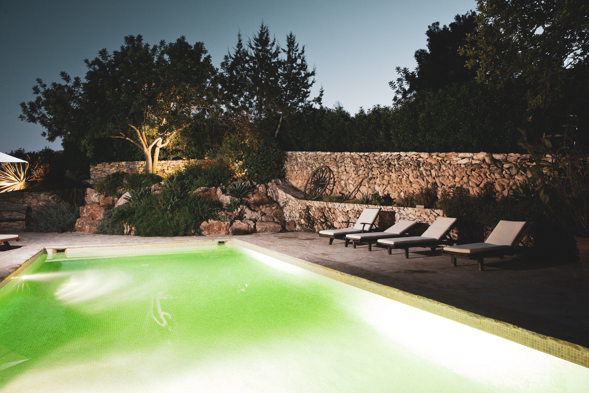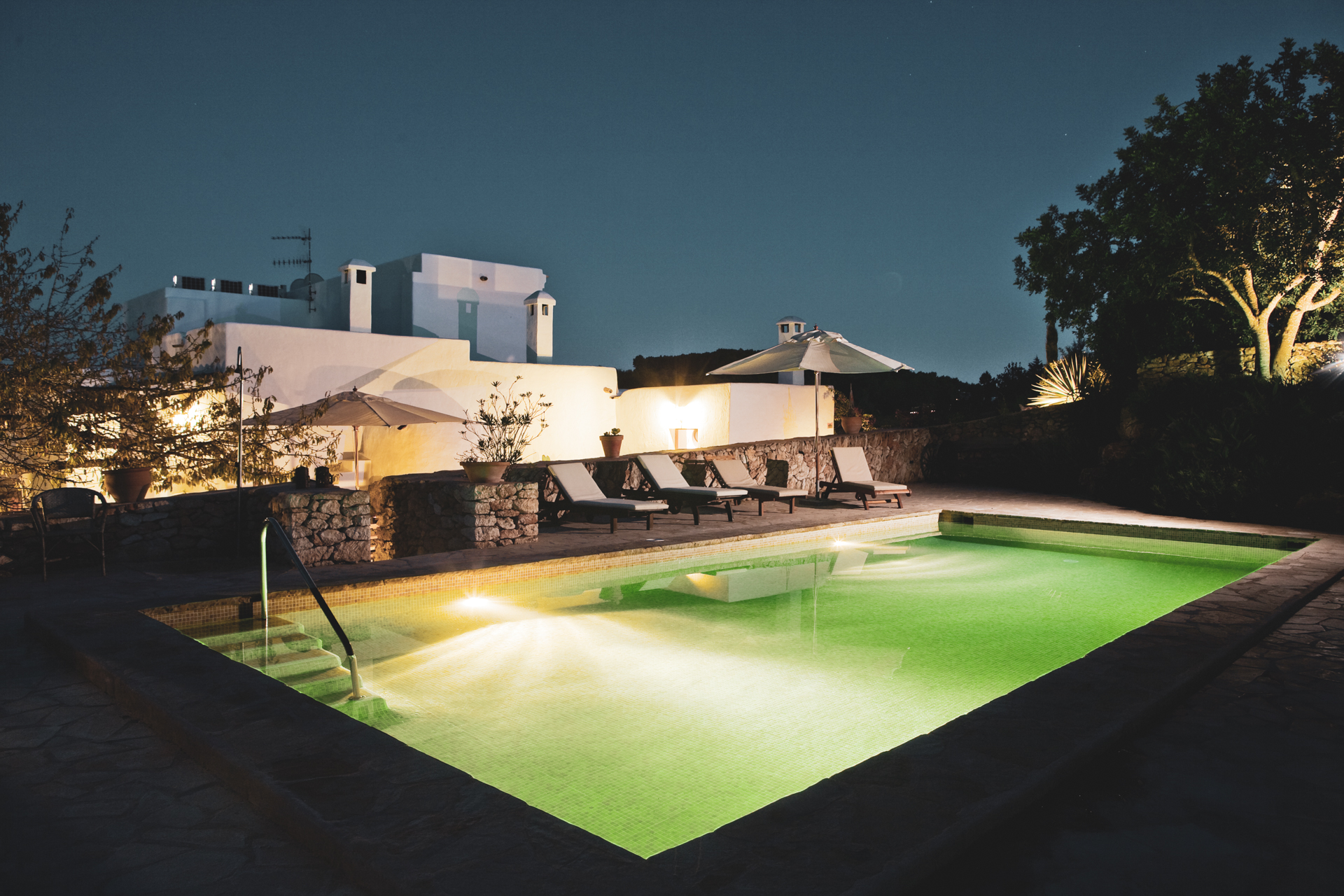 Hay un gran jardín que rodea la casa, solarium con cómodas hamacas y sombrillas. Con vistas a la piscina y al campo hay una gran cama chill-out, una zona de comedor al aire libre y una barbacoa. Esta casa es muy especial. Tiene ese estilo tradicional pero elegante a la vez y se ha convertido en una demanda y algo icónico de Ibiza.