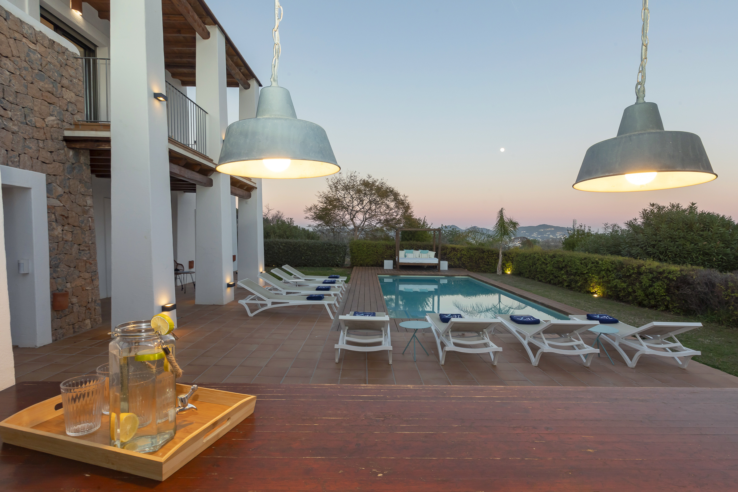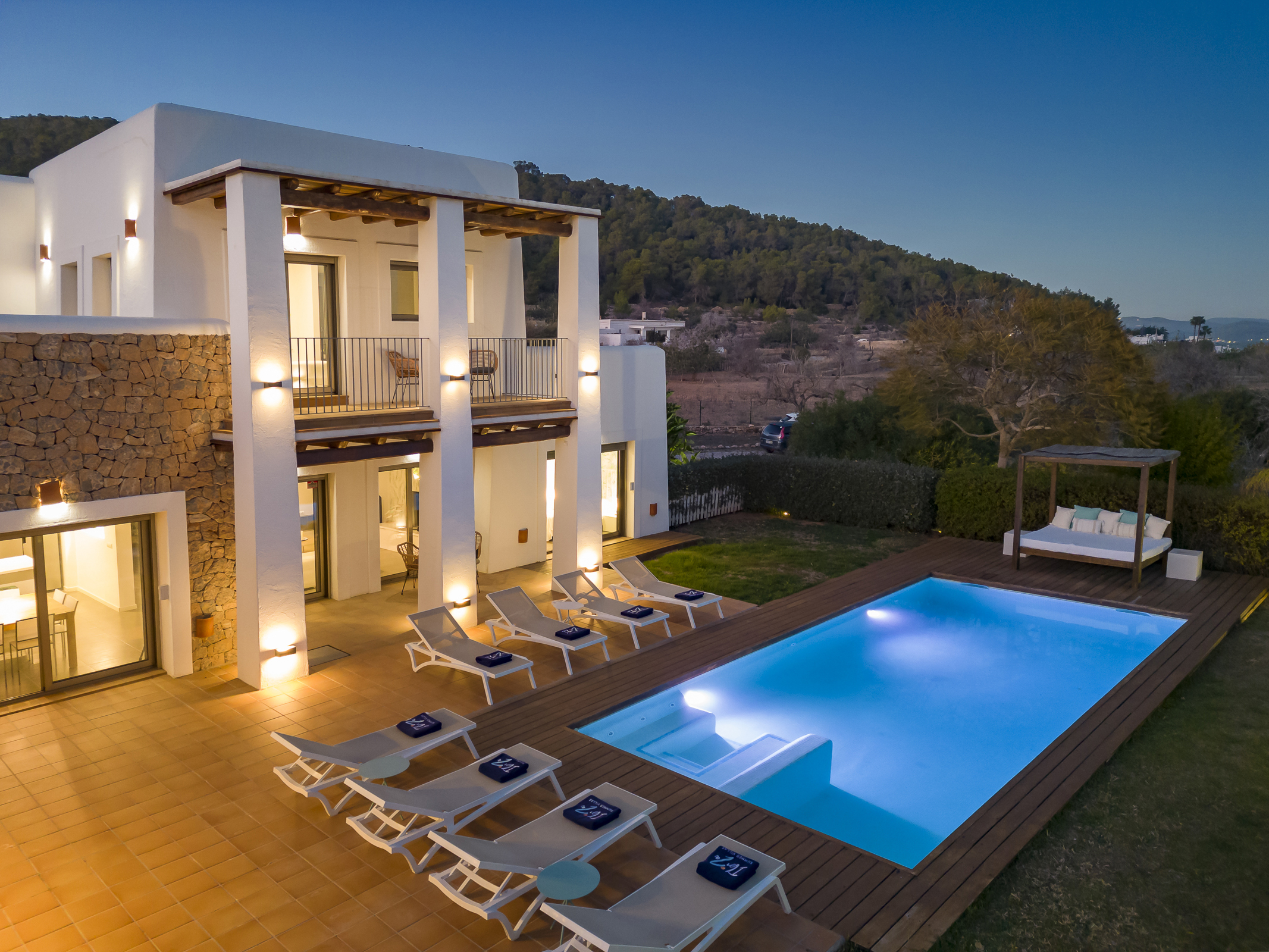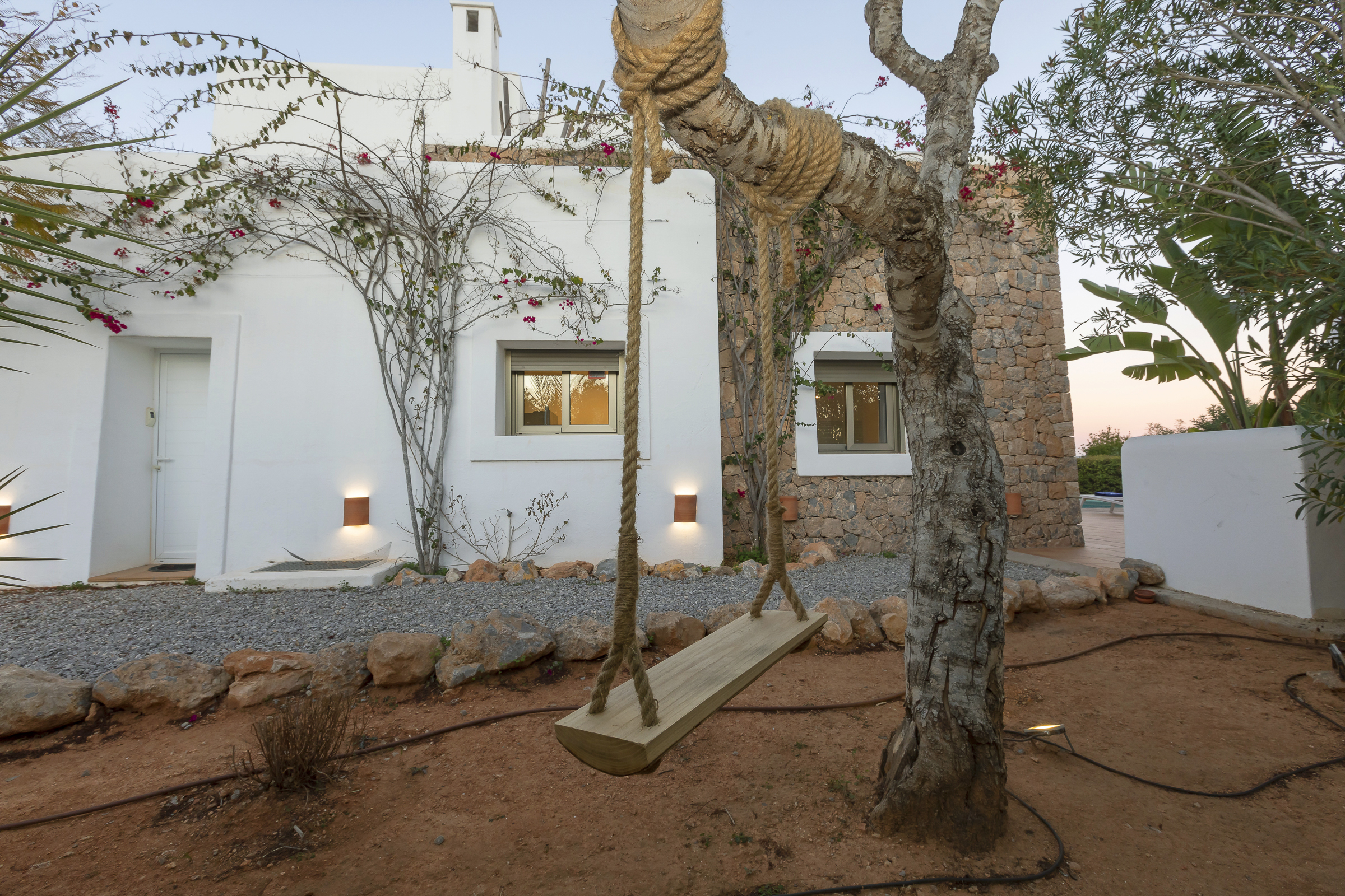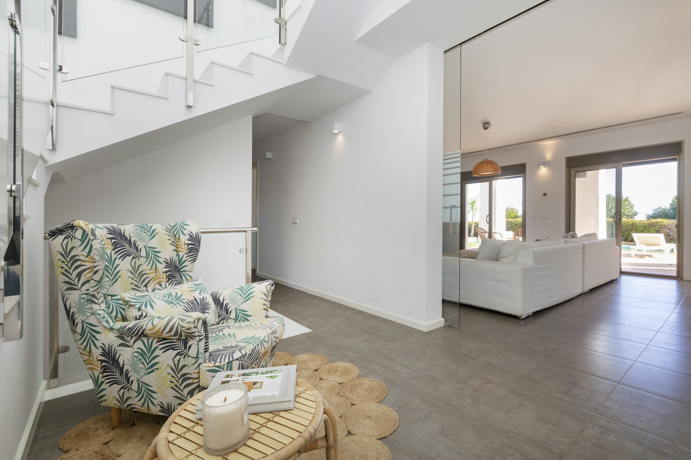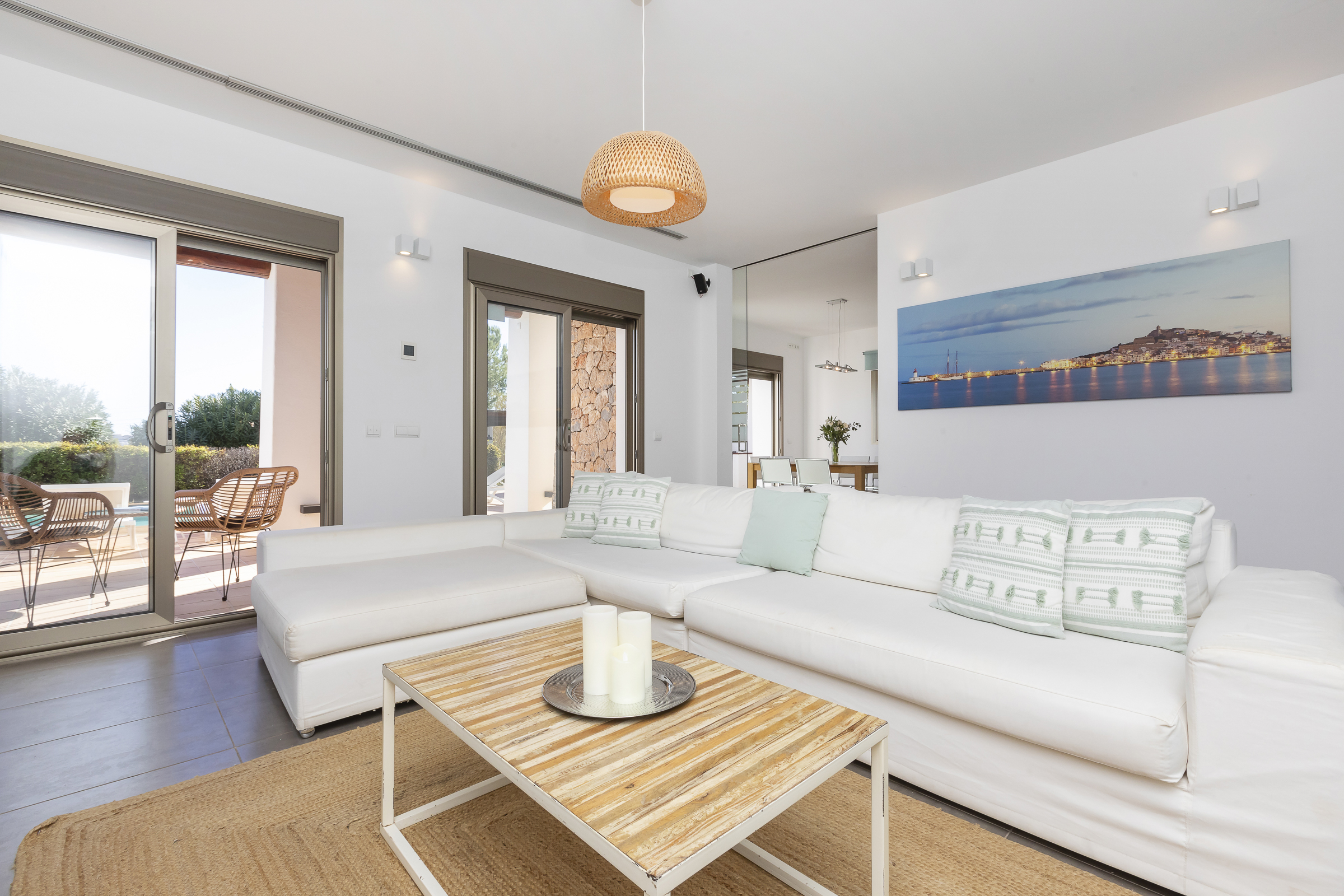 Sarete subito catturati da questa incredibile ed affascinante villa, caratterizzata dalla pietra di Ibiza su muri bianchi. L’ingresso della villa vanta un invitante atrio che vi conduce alla comoda area soggiorno, che include la cucina aperta e la zona pranzo, con vista e accesso sui giardini e la piscina, e una scalinata inondata di luce naturale proveniente dai lucernari incastonati negli alti soffitti.