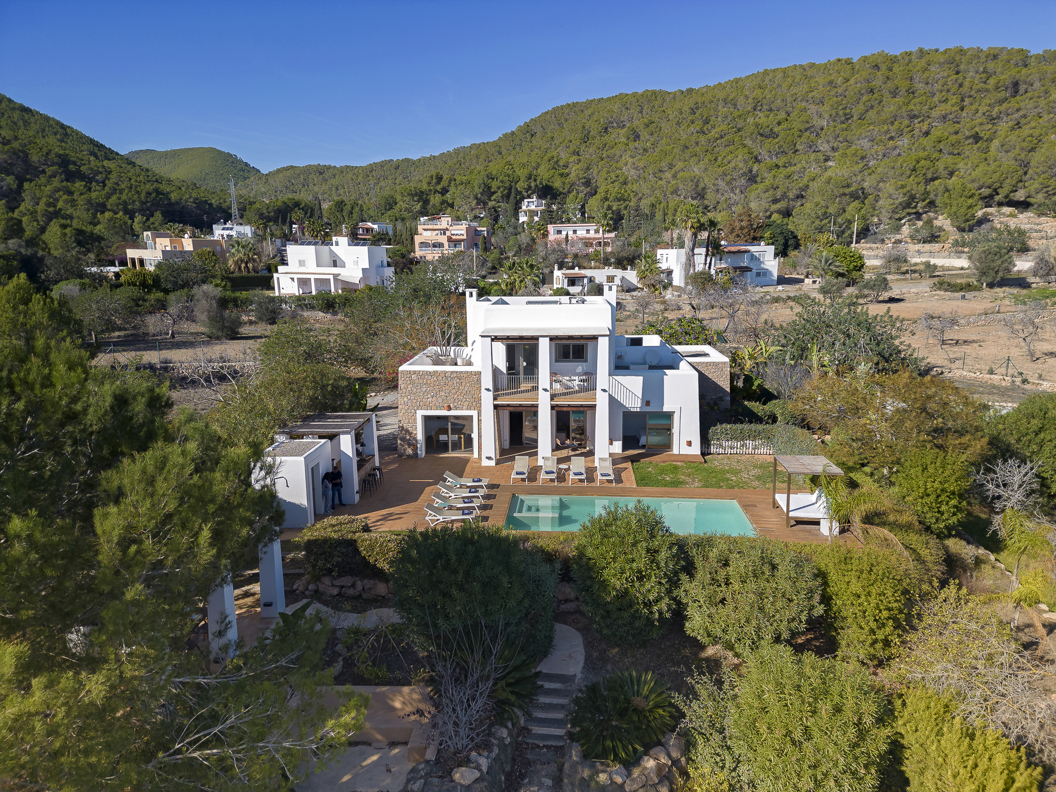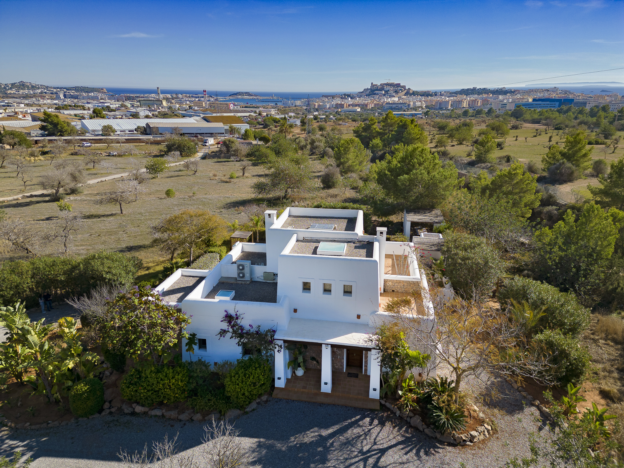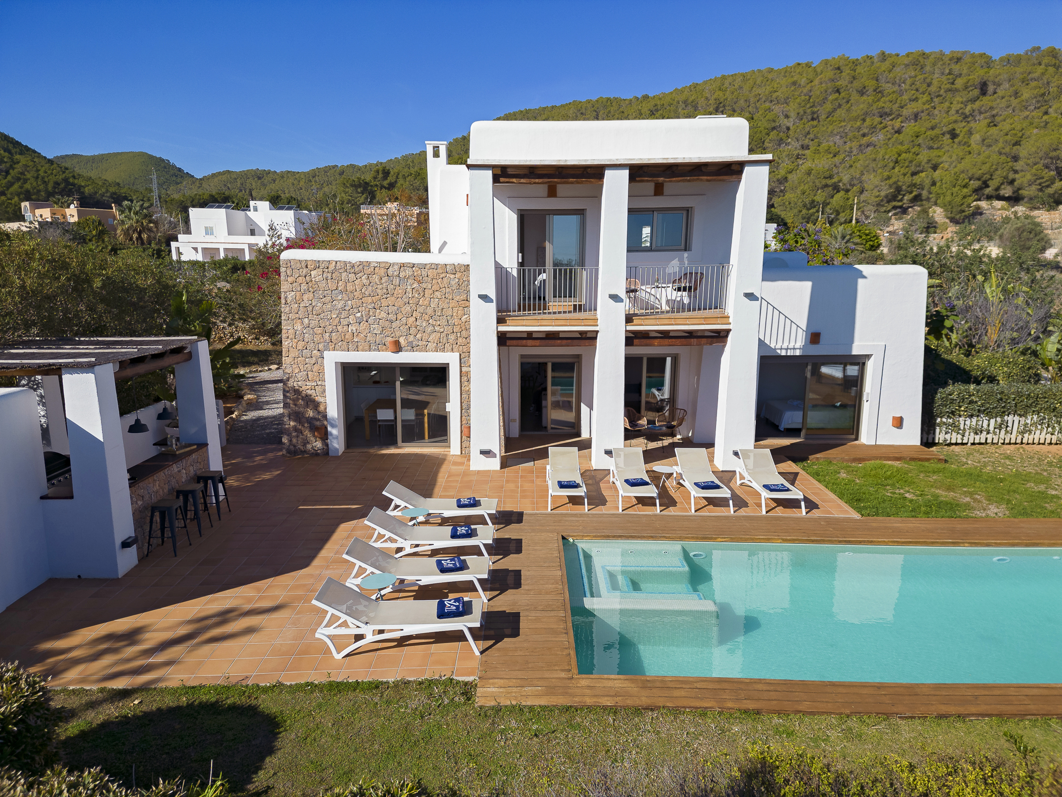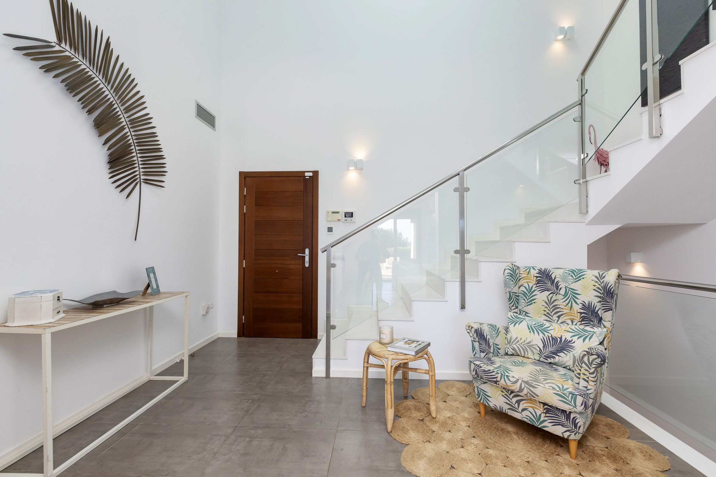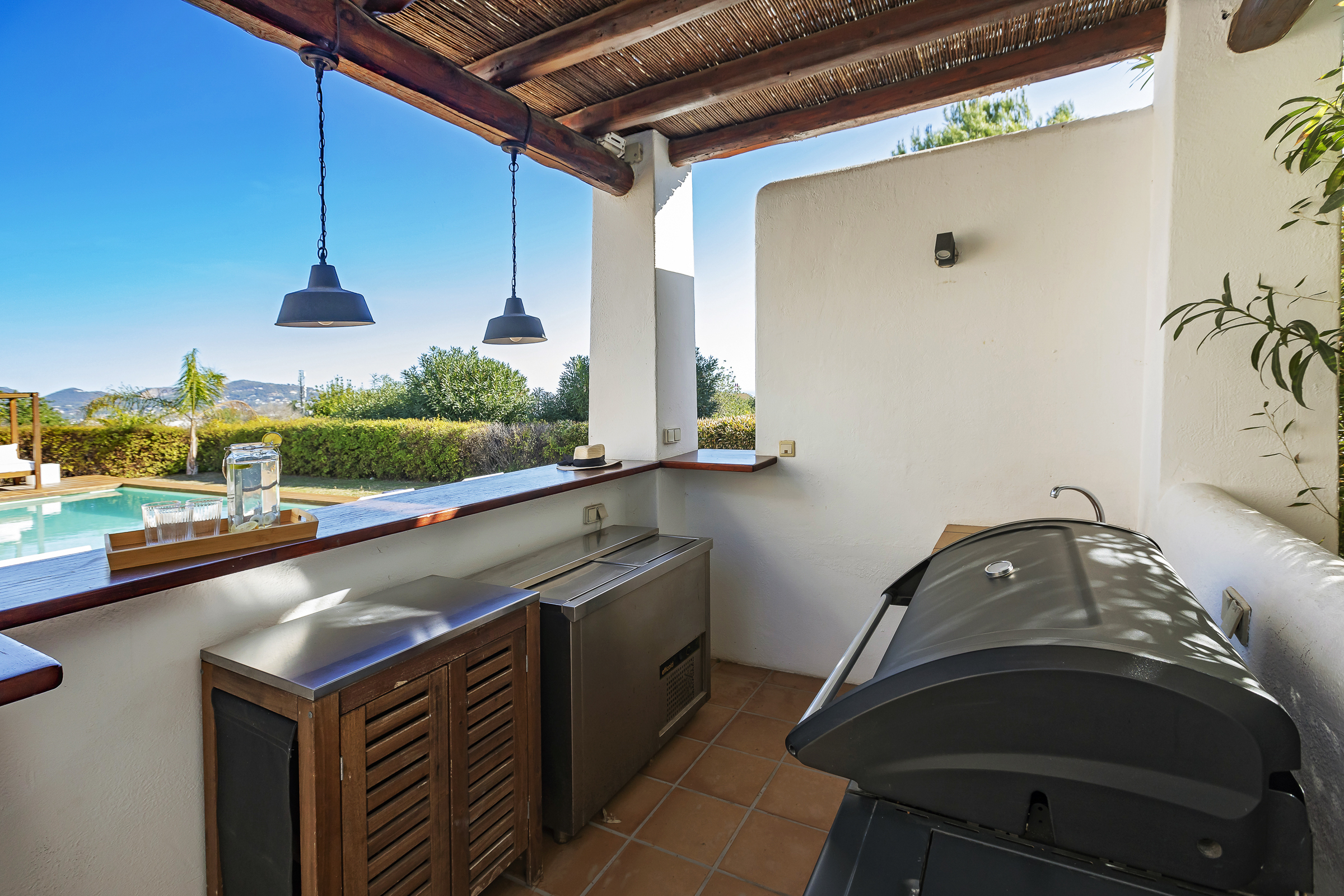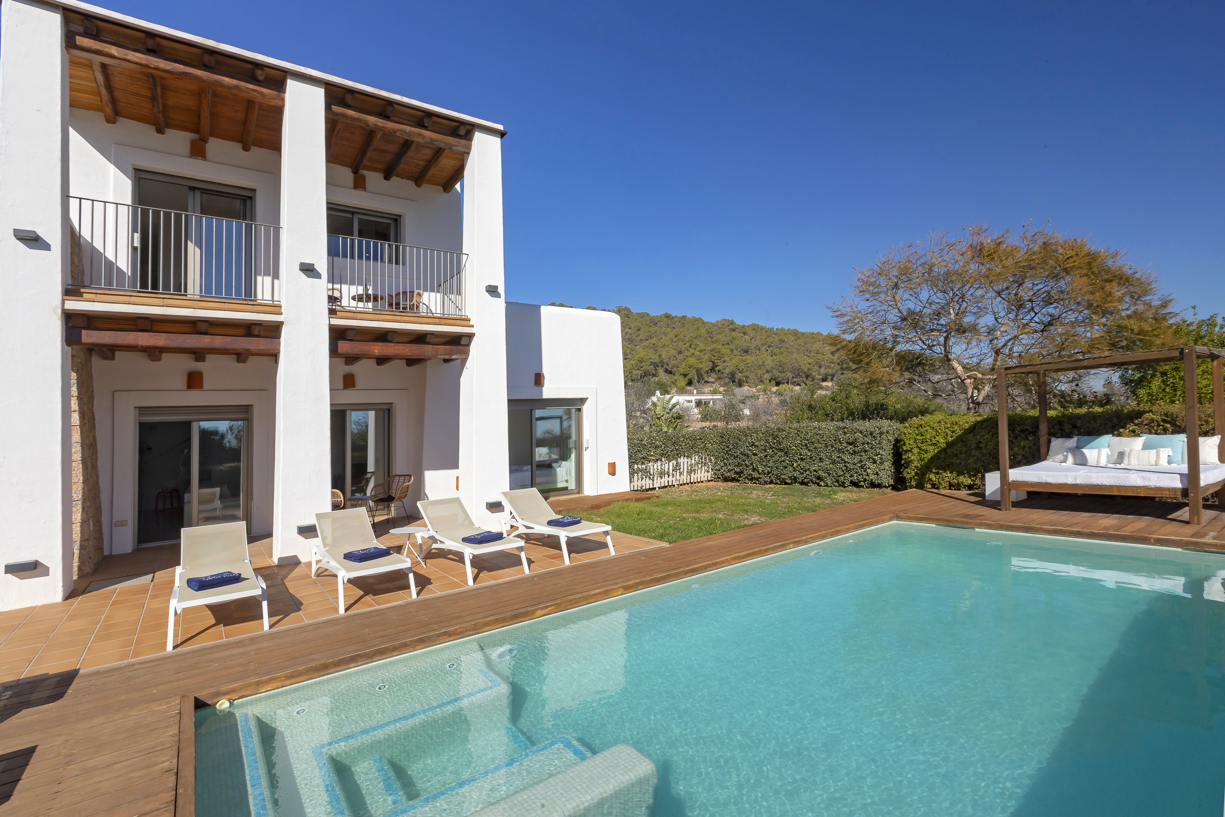 Sarete subito catturati da questa incredibile ed affascinante villa, caratterizzata dalla pietra di Ibiza su muri bianchi. L’ingresso della villa vanta un invitante atrio che vi conduce alla comoda area soggiorno, che include la cucina aperta e la zona pranzo, con vista e accesso sui giardini e la piscina, e una scalinata inondata di luce naturale proveniente dai lucernari incastonati negli alti soffitti.
