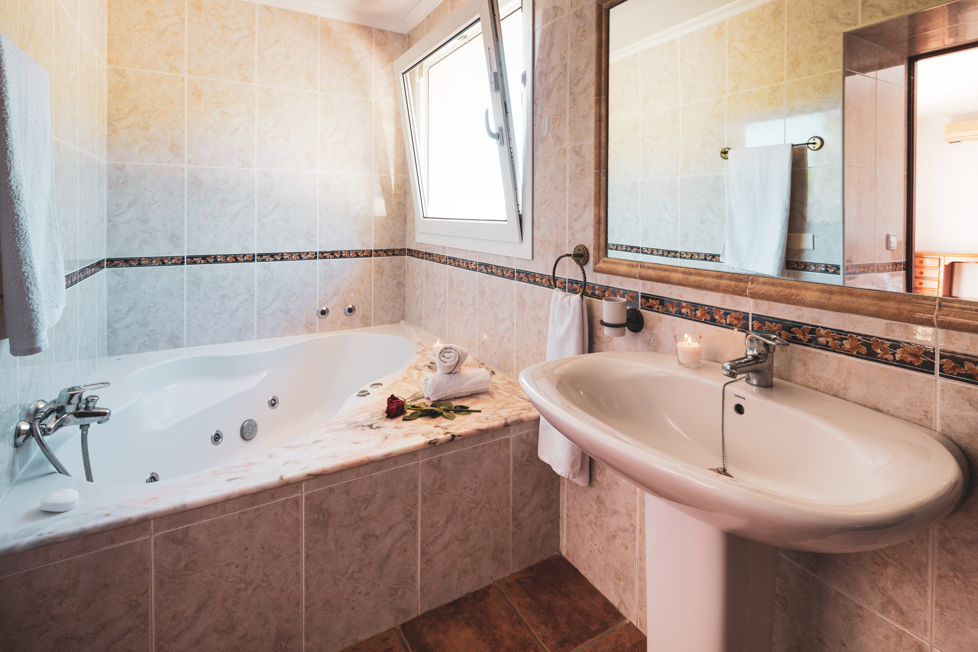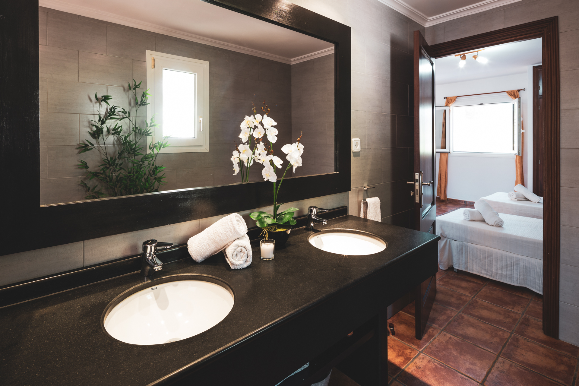 With five modern bedrooms (1 double and four twins) individually designed with stunning views overlooking the countryside or the sea – this villa you can truly sink in and enjoy the real side of Ibiza. On the first floor, the master bedroom has a large balcony ensuring your privacy, overlooking the pool and the south of the island. The master bedroom comes with it’s own en-suite bathroom. There are two twin bedrooms also on this same level which share the same en-suite bathroom.