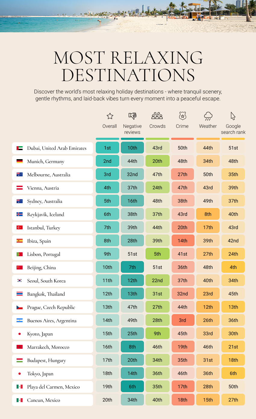 Based on our data, Dubai reigns as the world's most relaxing destination. Despite the city drawing in 17.1 million annual tourists, it actually ranks 43rd for tourist density due to its expansive urban layout. Dubai also boasts the 2nd lowest crime rate according to our study, that is a crime index of 16.1. It also has relatively low humidity, especially for a desert city, at 60%.