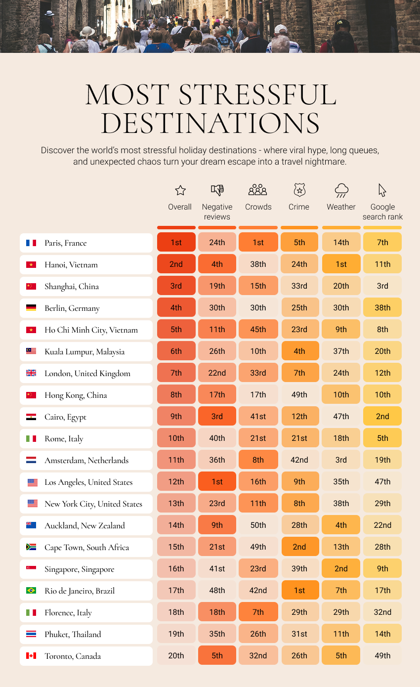 Not all holiday destinations are created equal, and some cities, despite their reputation, beauty and fame, can come with a sense of travel tension. From overcrowded streets and high crime rates to overwhelming weather, these destinations top the list for all of the wrong reasons. Based on a combination of safety, tourist density and comfort, these are the three most stressful destinations to visit in 2025.