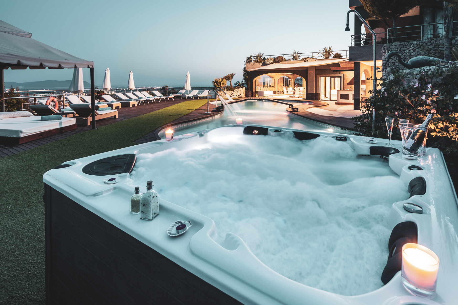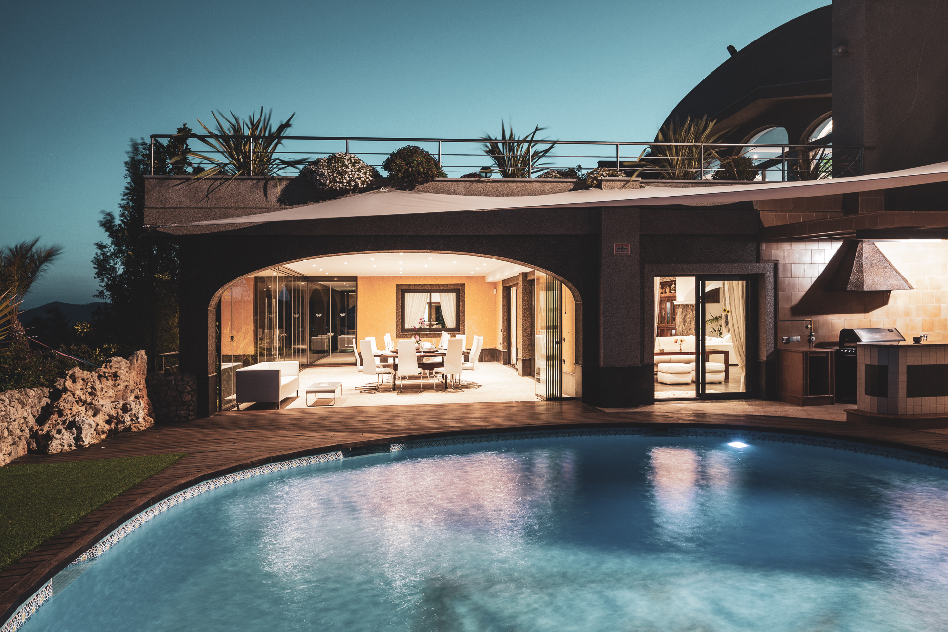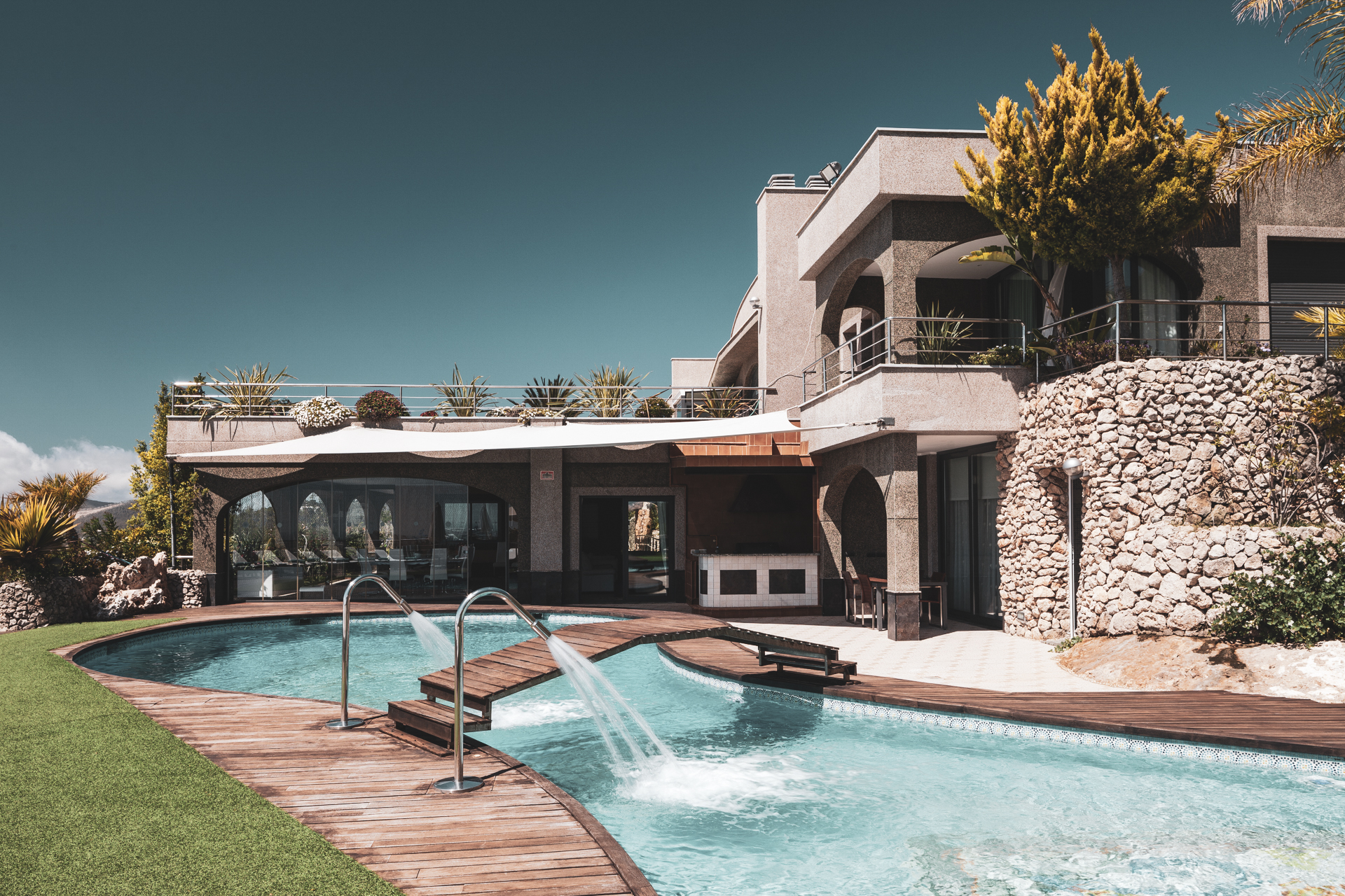 Vanuit de gang leiden de patio deuren aan de voorzijde van de villa naar een groot terras van waaruit u een verbluffend panoramisch uitzicht over het eiland geniet. Hier is meer dan voldoende ruimte waar u, in een van de ligstoelen of stoelen, lekker in de zon kunt luieren terwijl u geniet van het indrukwekkende uitzicht. Het enorme zwembad, compleet met waterfonteinen, nog meer zitgedeeltes, sauna, barbecueplaats en bar is de perfect plek om bij te komen van het exclusieve leven op Ibiza.