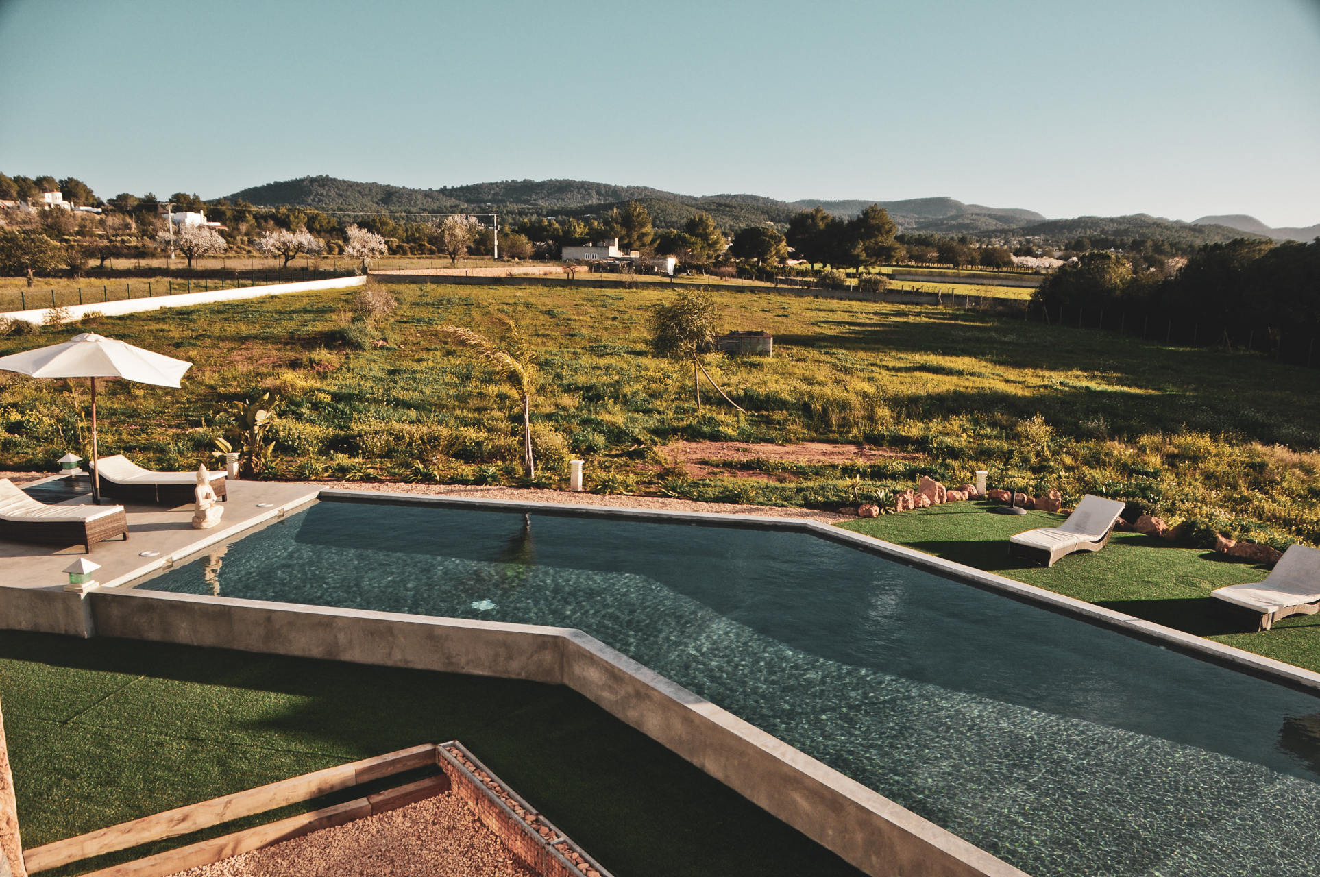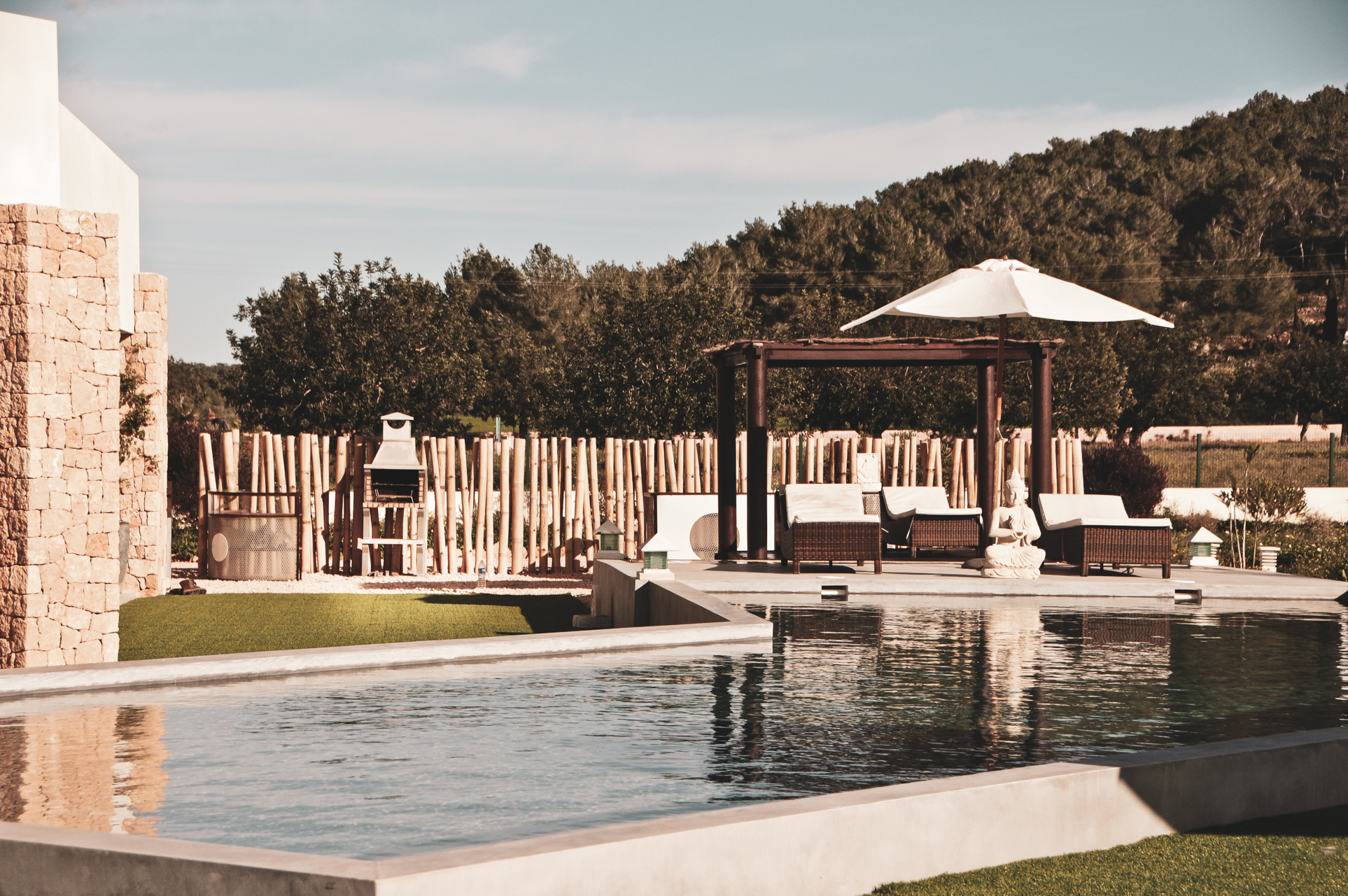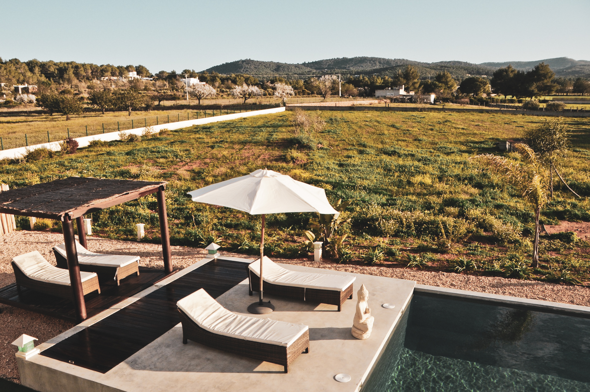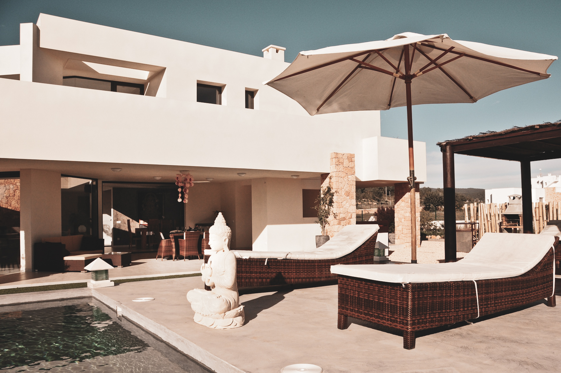 Buiten is het zwembad van de villa gewoonweg prachtig - dit is een van de grootste privézwembaden in Ibiza! Omringd door ligstoelen en Balinese cabana's, een nabijgelegen barbecue en beschutte eethoek, nodigt deze villa u uit om te relaxen en te chillen in stijl.