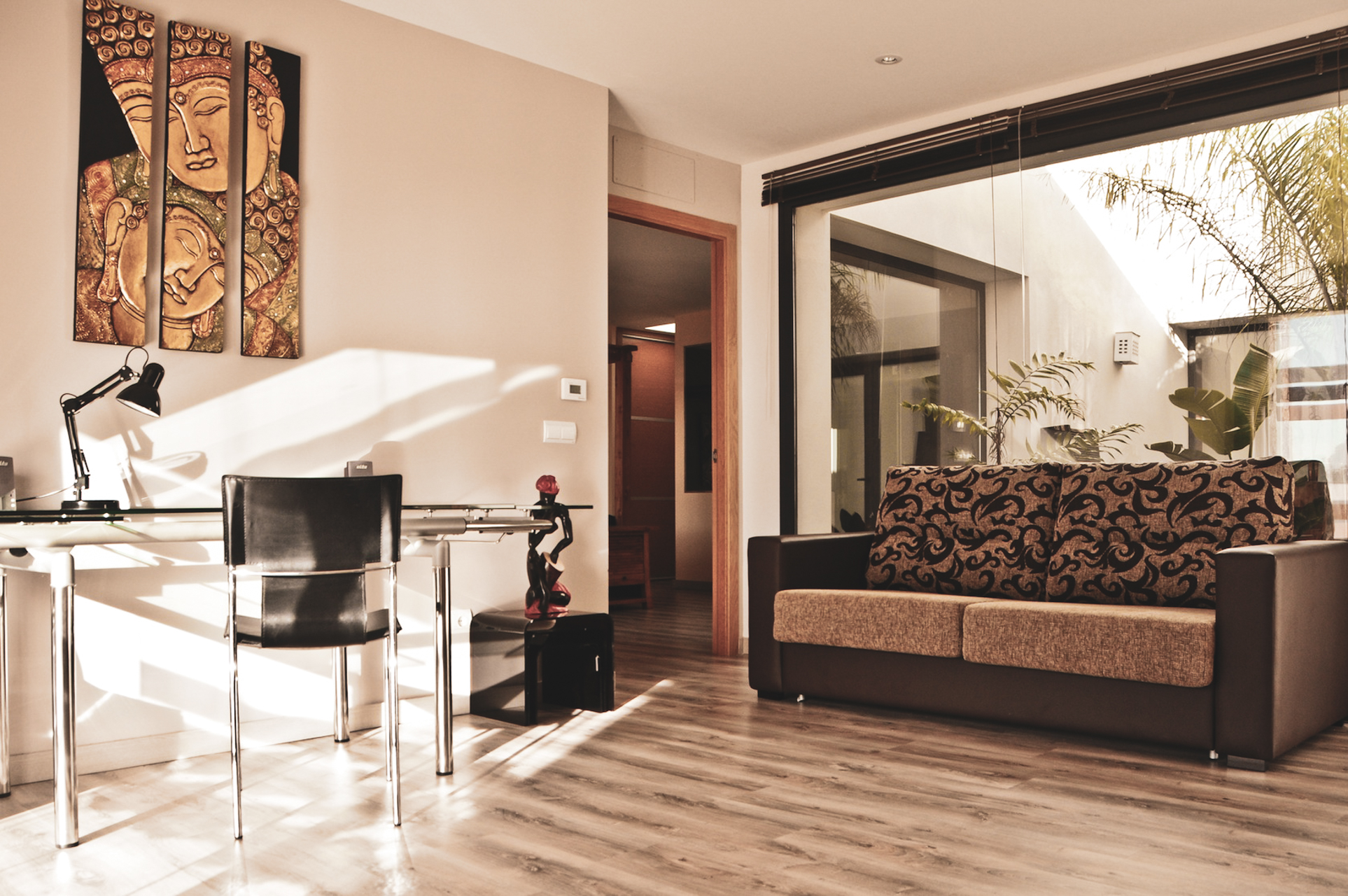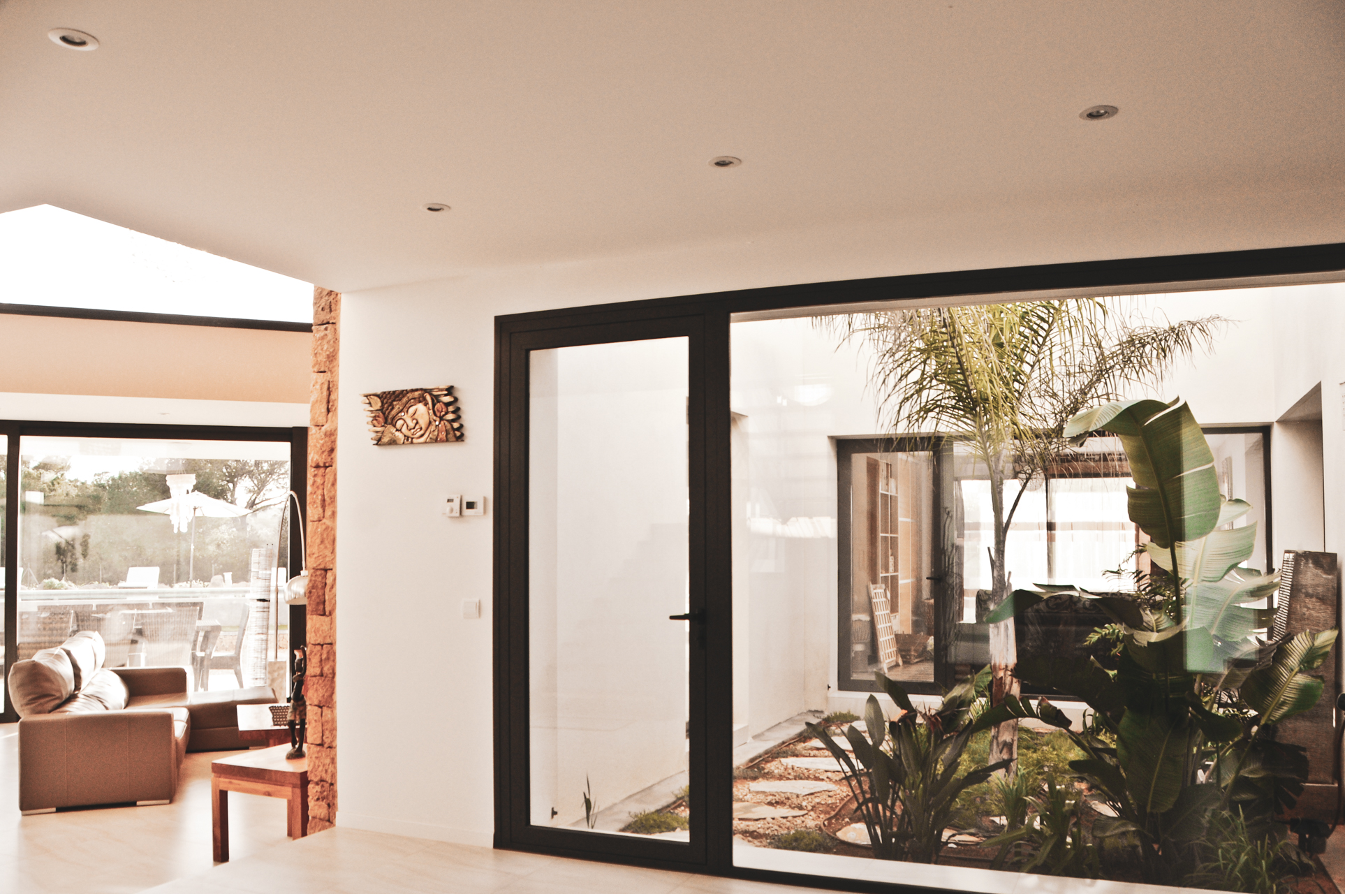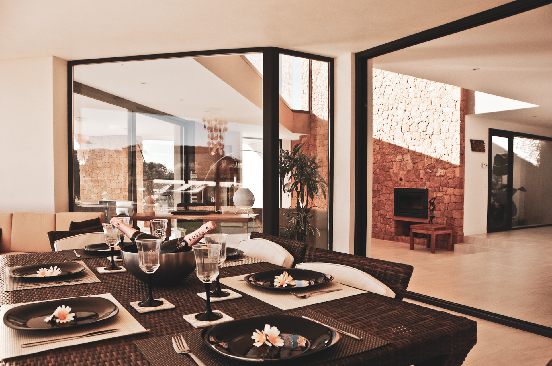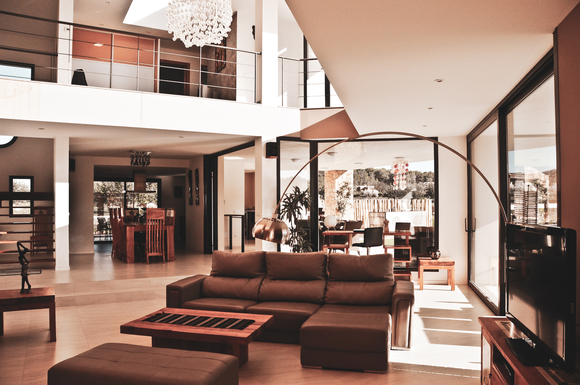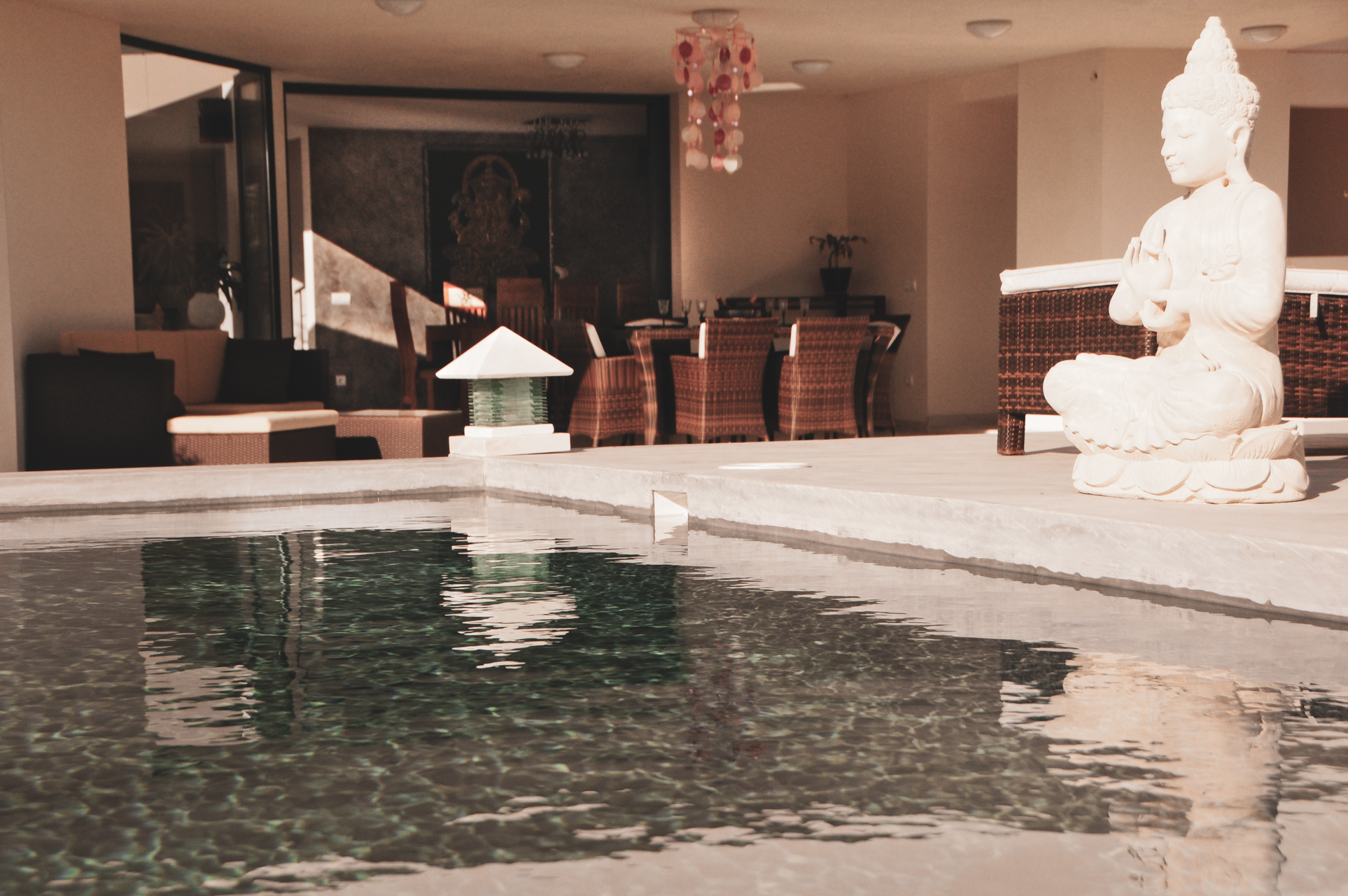 Op de begane grond is een prachtige woonkamer met chaise lounge, internet, satelliet TV, DVD speler, Stereo met iPod dock en surround sound. Een ongelooflijke glazen kroonluchter straalt luxe en stijl uit, terwijl grote glazen ramen en een binnentuin zorgen voor een prachtige lichtinval en luchtstroom door de hele villa.