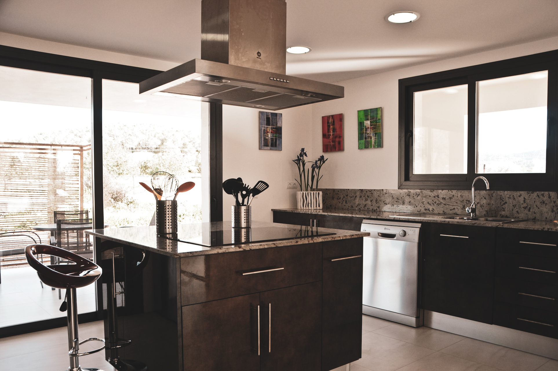 De strakke keuken in galerijstijl is uitgerust met alles wat u nodig hebt, inclusief vaatwasser, koffiezetapparaat, oven en koelkast/vriezer met een eiland in het midden met inductiekookplaat.