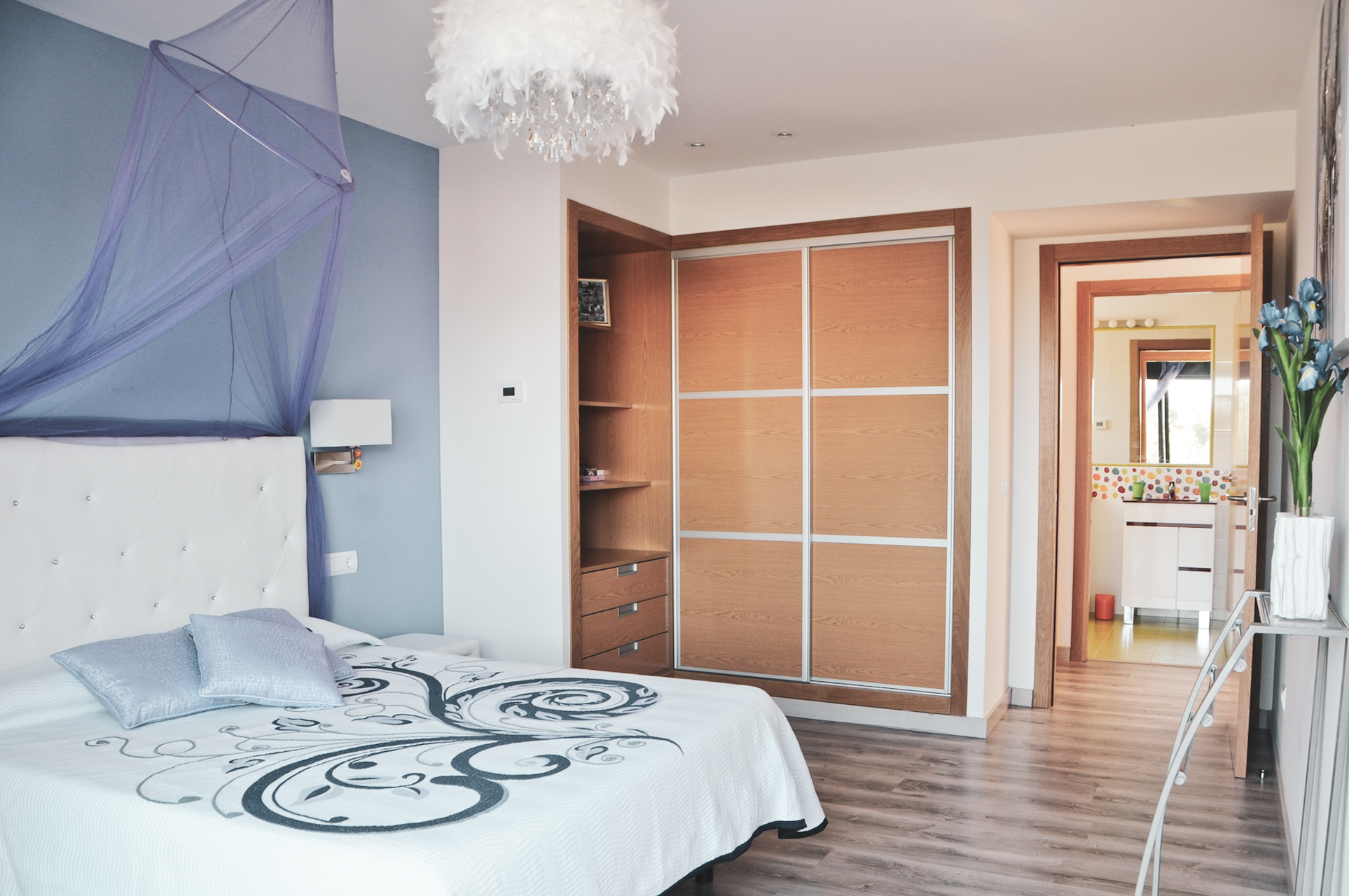 Op de bovenverdieping bevinden zich de overige drie tweepersoonsslaapkamers, evenals een badkamer voor twee van deze slaapkamers om te delen. Alle slaapkamers in de villa hebben een eigen balkon, elektrische verduisteringsluiken en ingebouwde kasten. De ruime ouderslaapkamer met en-suite badkamer is bijzonder indrukwekkend, met een douche in het midden van de kamer die een luxe statement maakt.
