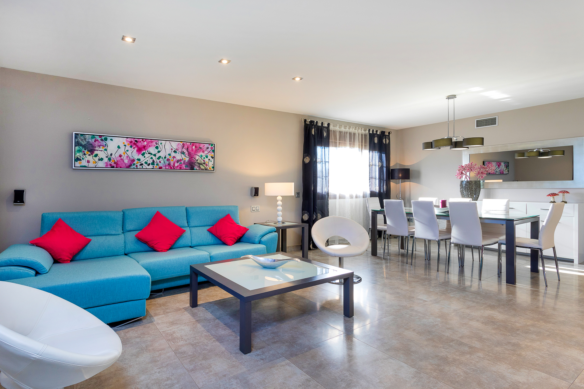 Het indrukwekkende open woon- en eetgedeelte, voorzien van een eigentijdse twist, is schitterend. Niet alleen de woonkamer, maar de gehele villa is voorzien van een prachtig modern ontwerp met lokale Ibiza-accenten. Het interieur van de gehele villa voldoet aan hoge kwaliteitseisen waarbij de woonkamer de perfecte plek is om aan het eind van de dag nog even heerlijk te ontspannen. In de woonkamer bevindt zich teven een slaapbank waar, indien nodig, 2 extra personen kunnen overnachten. Let op: u kunt dit 1e woongedeelte betreden zonder dat u hiervoor eerst toegang tot de hoofdvilla dient te verschaffen.